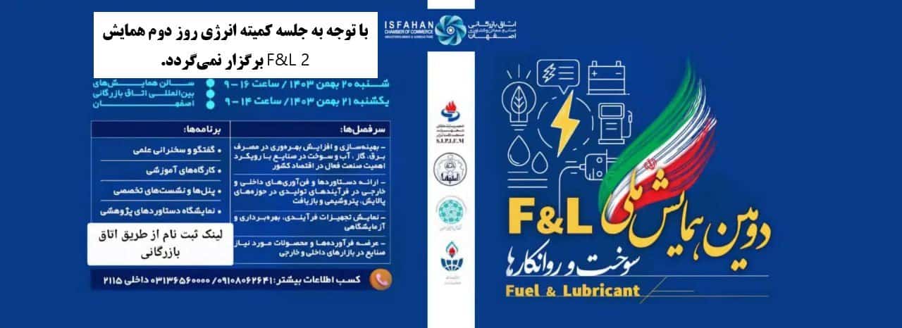 دومین گردهمائی صنعتگران، پژوهشگران، متخصصان و به عبارتی فعالین اقتصادی صنعت نفت و فرآورده های نفتی و انرژی های تجدید پذیر به صورت ملی و منطقه ای تحت عنوان همایش F&L (FUEL & LUBRICANT) با مشارکت اتاق بازرگانی و دانشگاه اصفهان ، همکاری شهرک علمی و تحقیقاتی اصفهان ، انجمن تولید کنندگان فرآورده های نفتی اصفهان،انجمن استصناء ( سازندگان تجهیزات صنعت نفت شعبه اصفهان) و واحدهای تولیدی صنعتی اصفهان و کشور در تاریخ 20 و 21 بهمن ماه سال جاری با "شعار توسعه اقتصادی بر محور صنعت پایدار "در محل سالن همایش های اتاق اصفهان و پیامبر اعظم دانشگاه اصفهان برگزار خواهد شد.